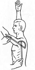 Угломер устанавливается в продольной плоскости, приставить к наружной поверхности плечевого сустава. Шарнир установить на головке плеча. Одну браншу вдоль тела, другую — по плечевой оси.
